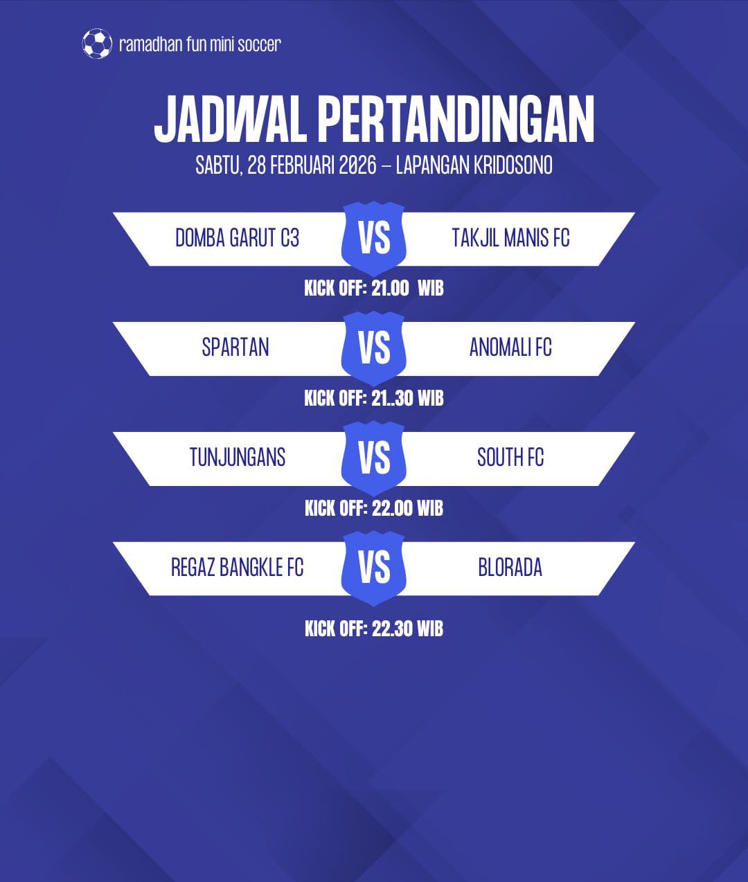 Ketua Panitia Pelaksana, Sultan Muva N.M, mengimbau agar seluruh tim peserta hadir 15 menit sebelum waktu kick-off guna memastikan kelancaran jadwal pertandingan. “Melihat antusiasme pada laga perdana kemarin, kami memprediksi Sabtu besok tensi pertandingan akan semakin menarik namun tetap dalam semangat fun soccer,” ungkapnya.
