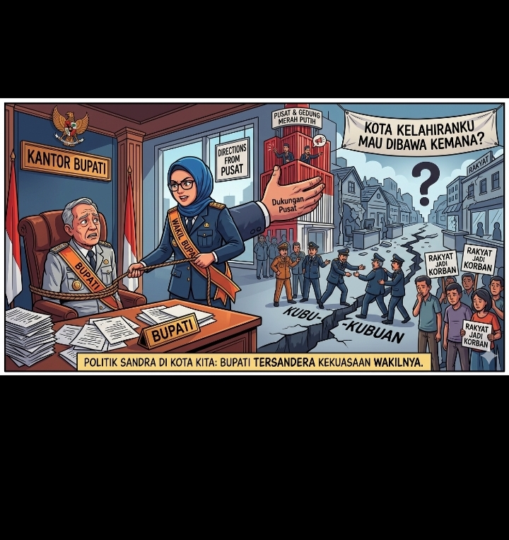 Radar Astacita – Opini, Wajah pemerintahan di kota kelahiranku belakangan ini tampak muram. Aroma keretakan di pucuk pimpinan bukan lagi sekadar rumor warung kopi, melainkan realitas yang menyesakkan. Kita sedang menyaksikan sebuah drama yang destruktif: Politik Sandra. Bupati, yang seharusnya memegang mandat penuh sebagai nakhoda pembangunan, seolah kehilangan kendali. Tekanan besar dari sang wakil—yang disokong oleh kekuatan raksasa di pusat dan bayang-bayang pengaruh di “Gedung Merah Putih”—telah menciptakan kebuntuan kepemimpinan.